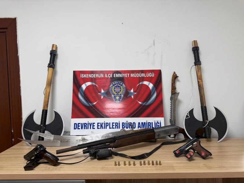 İskenderun ilçesinde bir kişinin evinin balkonunda tüfek, tabanca, balta ve kılıcı asılı şekilde sergilemesi polis ekiplerini harekete geçirdi. Şüpheli gözaltına alınarak hakkında işlem başlatıldı.