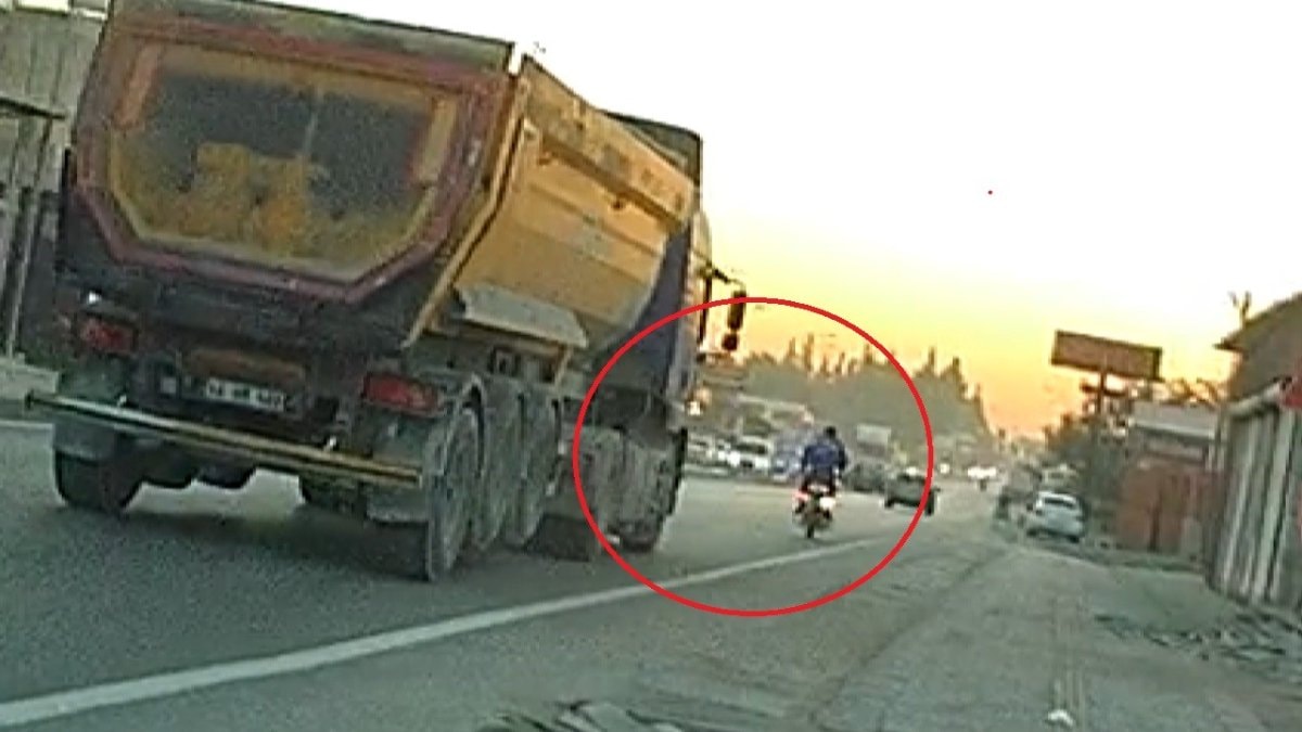 Trafikte ilerleyen motosiklet sürücüsü, hafriyat kamyonunu sağ tarafından sollayarak tehlikeye neden oldu.