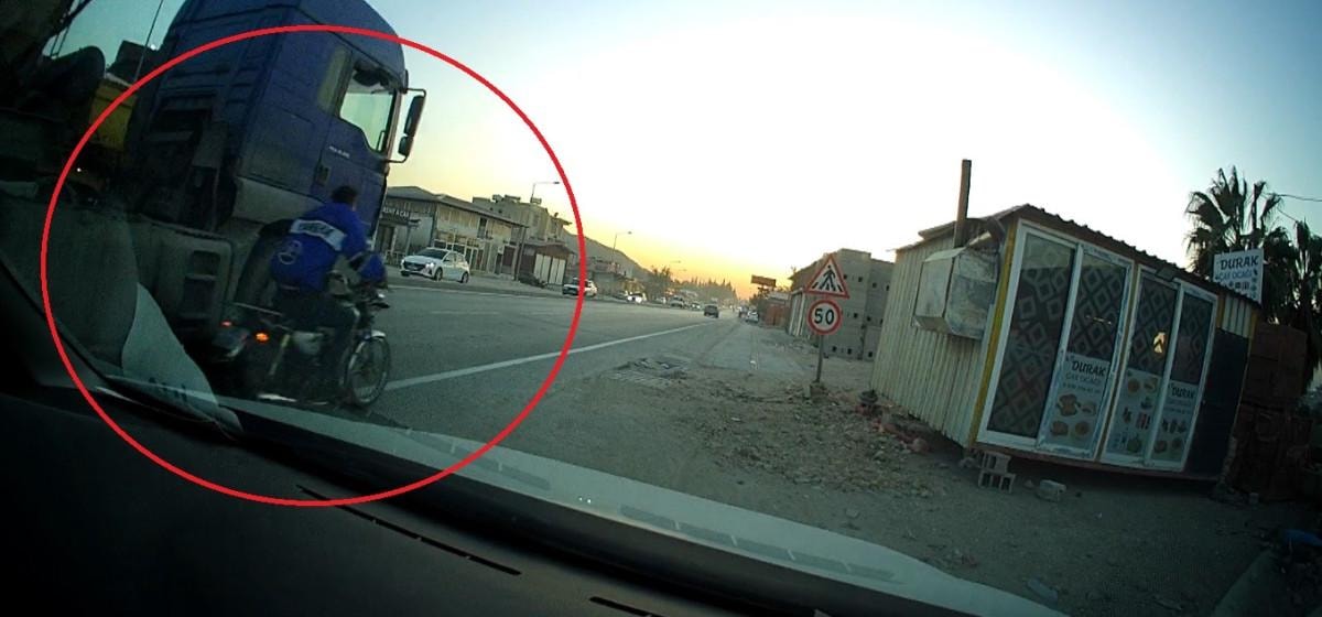 Hatay'ın Antakya ilçesi Narlıca Mahallesi mevkiinde motosiklet sürücüsü, hem kendi canını hem de diğer sürücülerin canını hiçe atarak trafiği tehlikeye soktu.