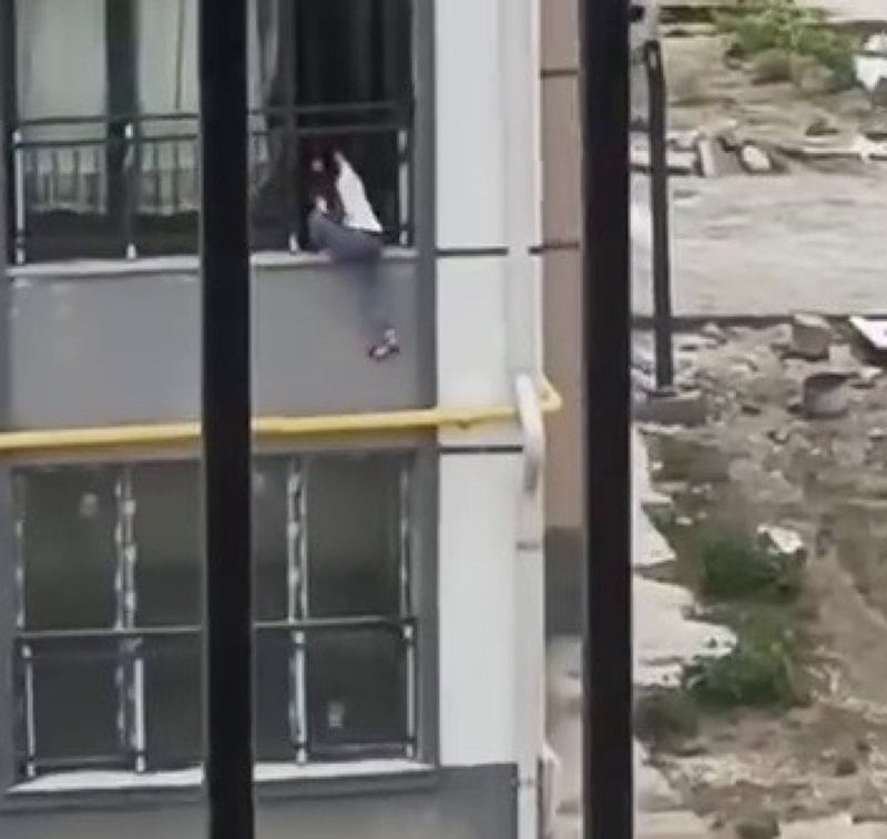 Mahallede bulunan deprem konutlarında 1. katta yaşayan bir ailenin kız çocuğu evin camından dışarı çıktı ve korkuluklardan tutunarak tehlikeli hareketler yaptı.