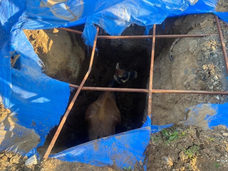 Kısa sürede bölgeye gelen itfaiye ve iş makinesinin yardımıyla büyükbaş hayvan kurtarıldı.