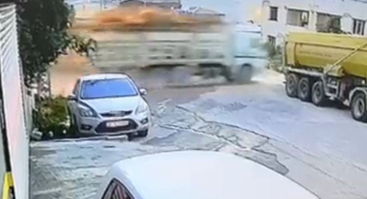 Demir yüklü kamyonun duvardan uçtuğu anlar ise güvenlik kamerasına yansıdı.