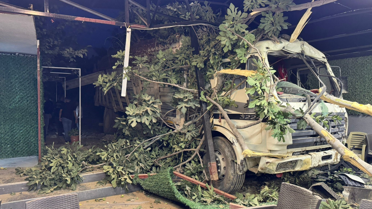 Hatay'ın Antakya ilçesinde M.T. idaresindeki kamyon, sürücüsünün direksiyon hakimiyetini kaybetmesi sonucu yaklaşık 8 metre yükseklikten bir restoranın bahçesine düştü.