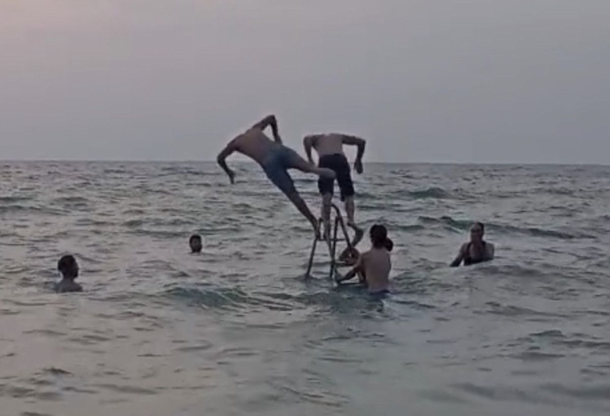 Denizin ortasına merdiven kuran ve üzerine çıkarak atlayan gençler kameralara yansıdı.