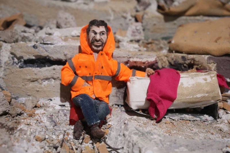 Depremde kız kardeşinin ölümünden etkilenen Kocaman, iki çocuk babası olmasının verdiği üzüntüyle Kahramanmaraş'ta deprem enkazında evladının elini bırakmayan Mesut Hançer'den etkilenerek olayı minyatürize etti.