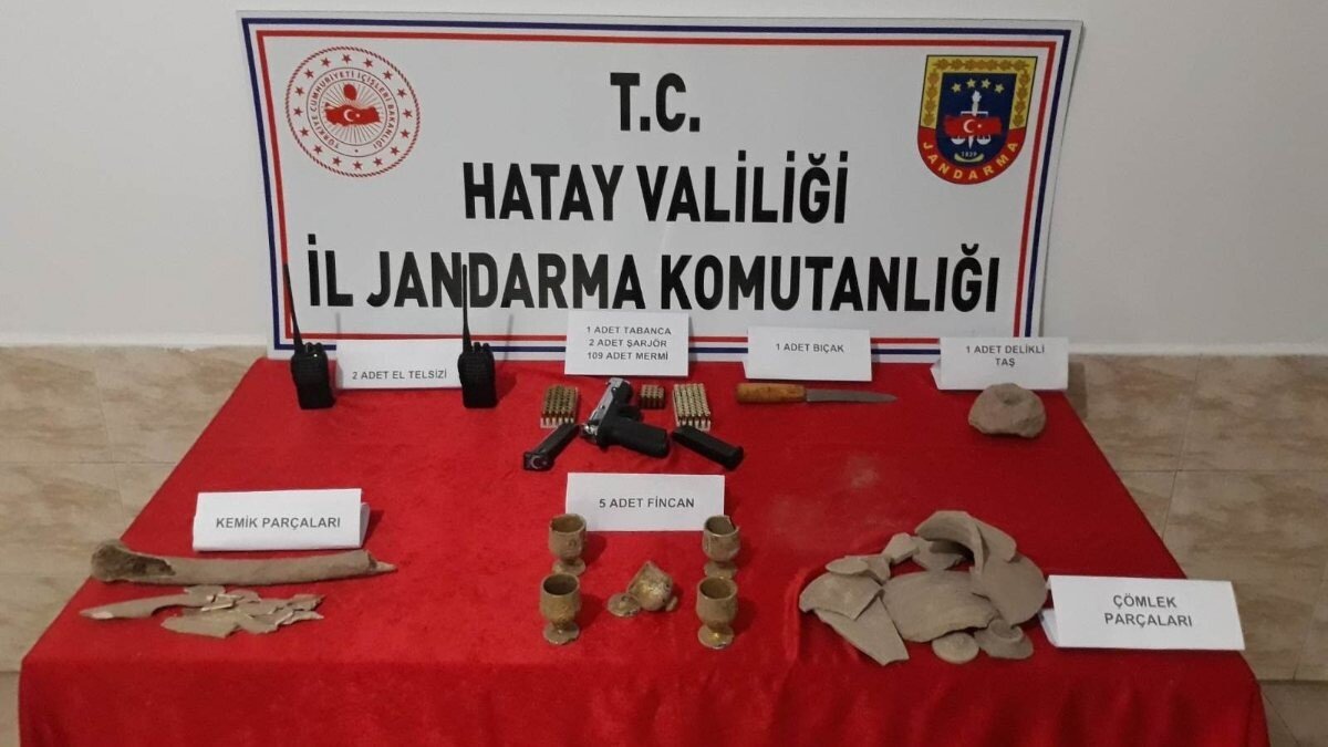 Şüpheliler, kepçe ile kazı yaptıkları esnada 5 adet tarihi eser olduğu değerlendirilen fincan, 1 adet ortası oyuk taş, 1 adet bıçak, 2 adet el telsizi, 1 adet kurusıkı tabanca, 28 adet kurusıkı fişek, 109 adet 9 mm fişek ve 2 adet tabanca şarjörü ile birlikte yakalandı.