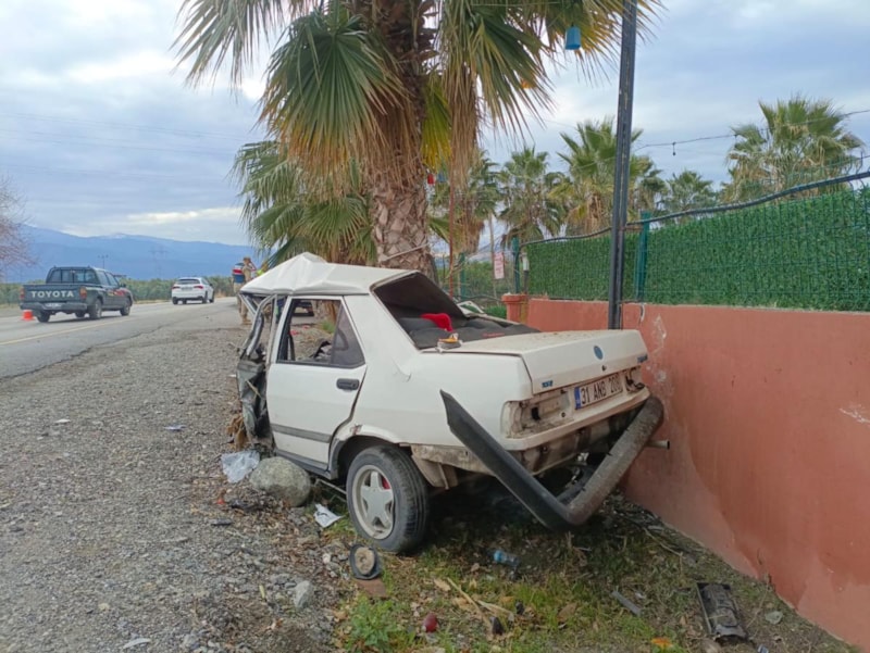Hatay'ın Erzin ilçesi Bahçelievler Mahallesi'nde Kadir Erdem yönetimindeki otomobil, sürücüsünün kontrolü yitirmesi sonucu yol kenarındaki iş yerinin duvarı ile palmiye ağacına çarptı.