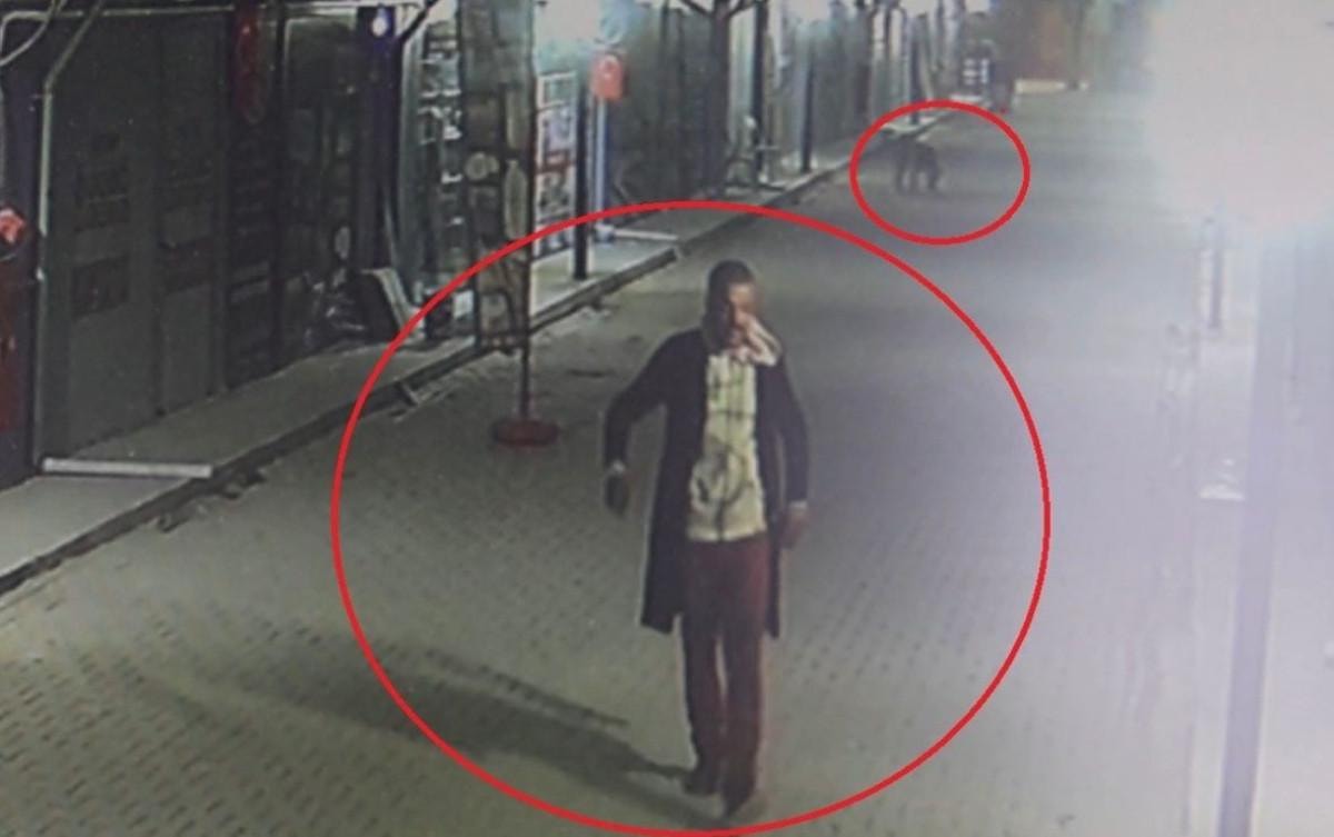 Güvenlik kamerası görüntülerini izleyen esnaf, kimliği belirsiz bir kişinin yanında 3 sokak köpeğiyle geldiğini ve iş yerlerinin etrafında dolaştığını gördü.