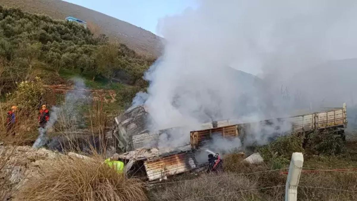 Ardından yoldan çıkıp tarlaya uçan tırdan alevler yükseldi.