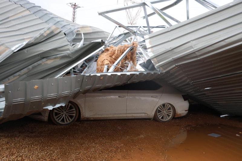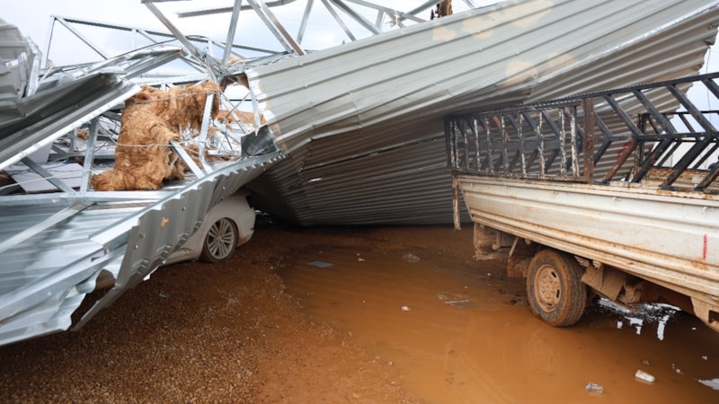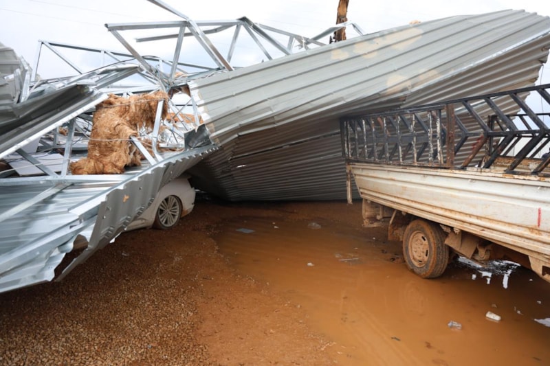 Kuvvetli fırtınanın zarar verdiği inşaat alanında, çatıları kaldırma ve arabaları kurtarma çalışmaları devam ediyor.
