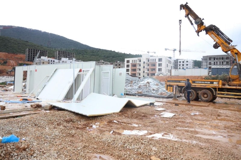 Cebike Mahallesi'nde inşaat alanında kuvvetli fırtına sebebiyle prefabrik ve konteyner ofislerin çatıları zarar gördü.