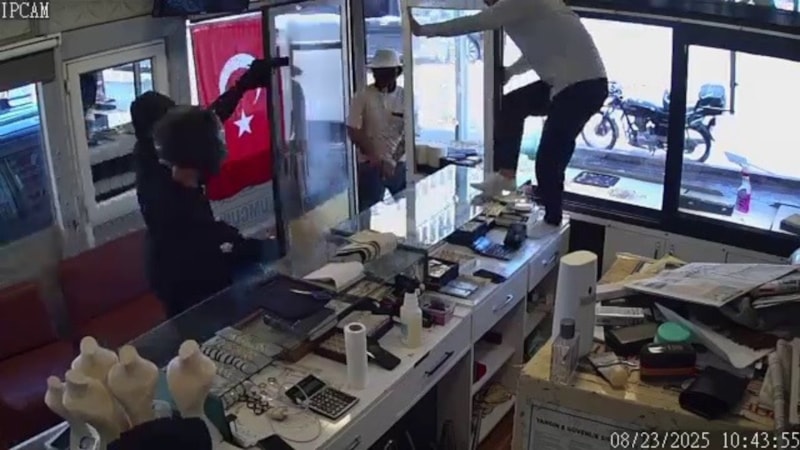 Hatay'da bir kuyumcuda soygun girişiminde bulunan silahlı 3 şahıs ve iş yeri sahibi arasında yaşanan arbede kameraya yansıdı.