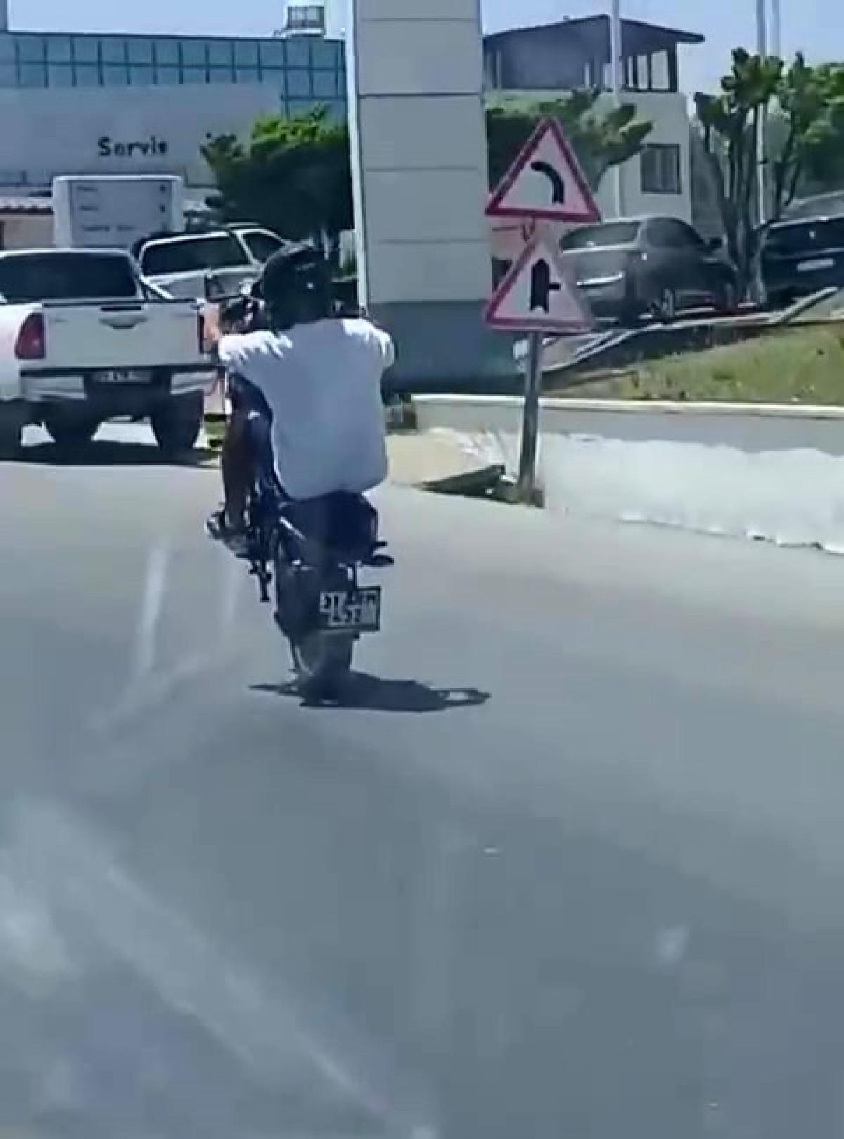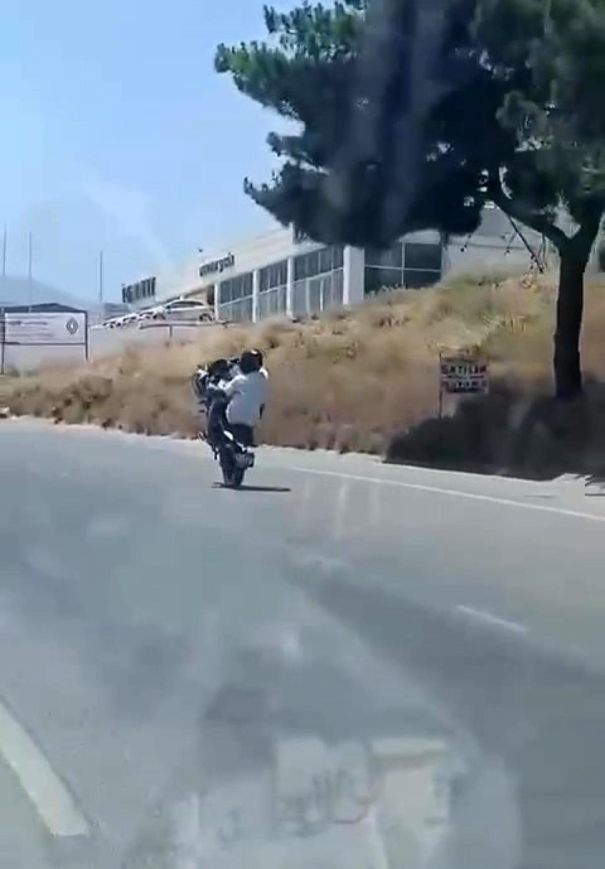 Hatay İskenderun-Antakya yolu üzerinde kimliği henüz belirlenemeyen motosiklet sürücüsü, trafikte seyir halindeyken ön tekeri havaya kaldırarak uzun süre bu şekilde ilerledi.