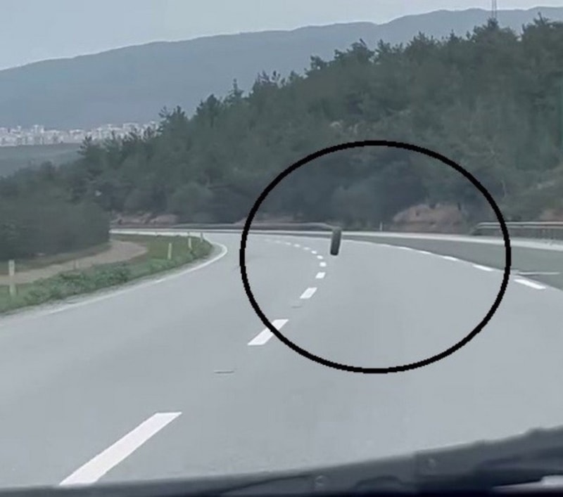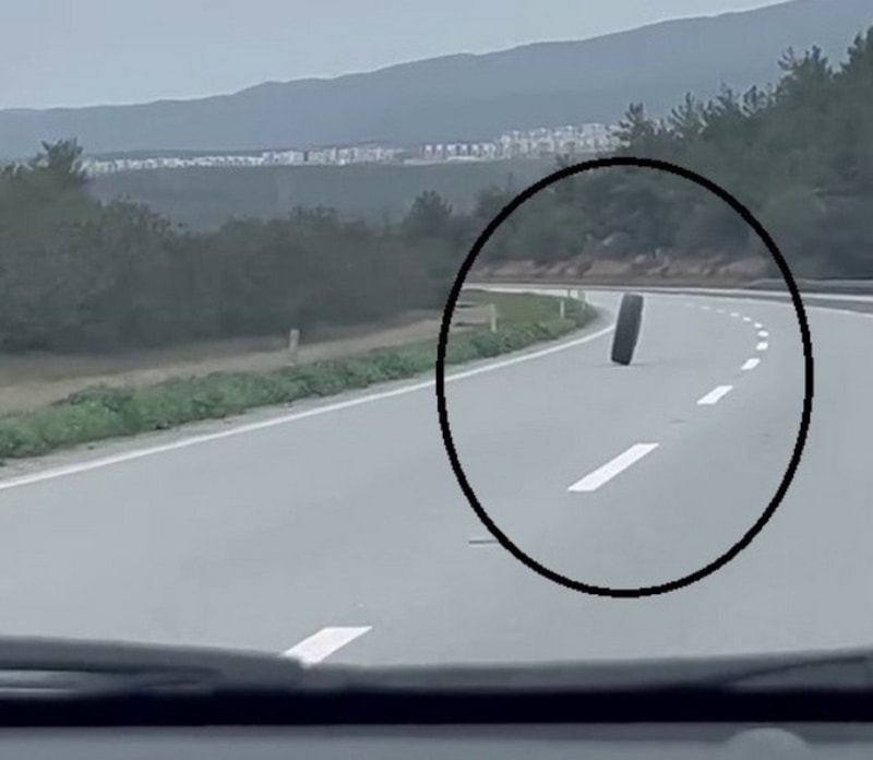Kopan lastik, otoyolda bir süre başıboş şekilde ilerleyerek sürücüler için tehlike oluşturdu. O anlar, çevredeki vatandaşlar tarafından cep telefonu kamerasıyla kayda alındı.