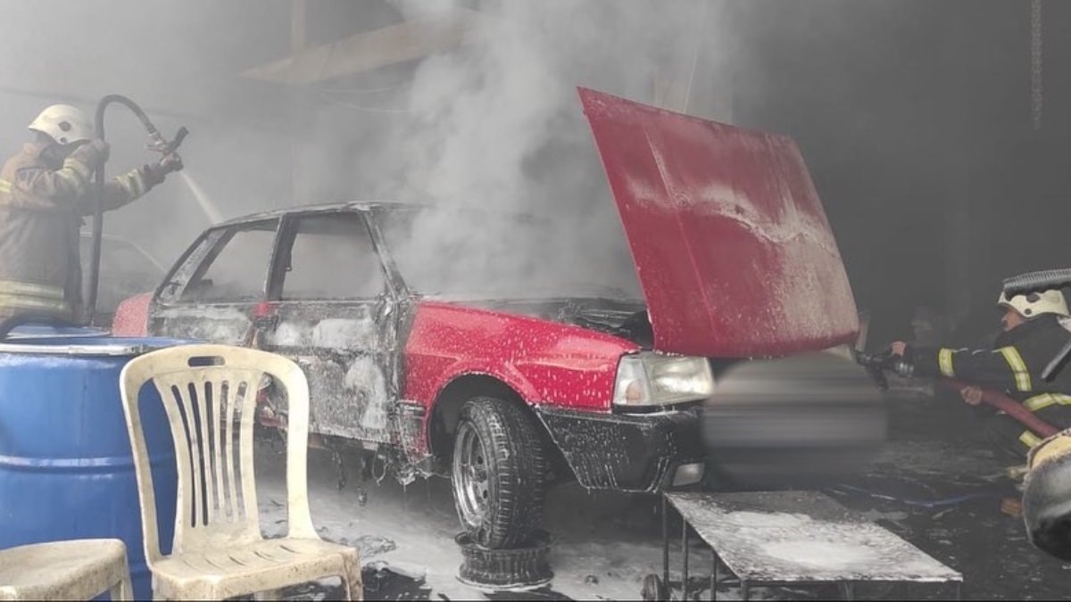 Hatay'ın İskenderun ilçesi Muradiye Mahallesi’nde yaşanan olayda, sanayi içerisindeki dükkanda park halinde olan Fiat Tofaş marka otomobilin motor kısmından alevler yükseldi.