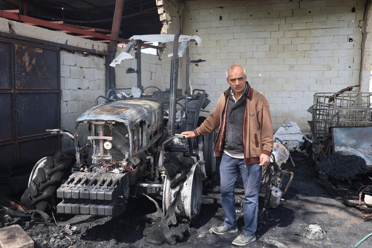 Saat 02.30 sıralarında buradan alevler yükseldi. Motosiklet yanınca traktöre sıçradı. Traktörün ön lastiği patlayınca biz sesle uyanarak yangını fark ettik. Mazot tutuşunca arka taraf da yandı. Burada 3 motosiklet, 1 sıfır traktör, çiftçi ekipmanlarımız, gübremiz ve ev eşyamız yandı. Şükürler olsun can kaybımız yok.