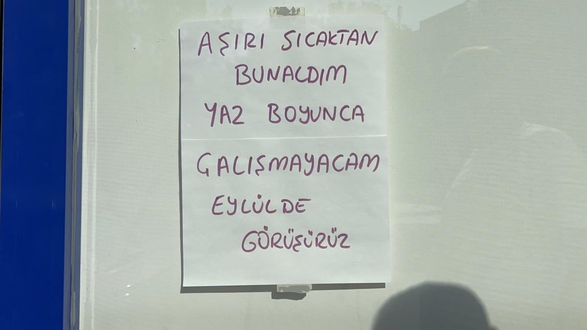 Enafın iş yerinin camına astığı notta, "Aşırı sıcaktan bunaldım, yaz boyunca çalışmayacağım. Eylülde görüşürüz." ifadeleri yer aldı.