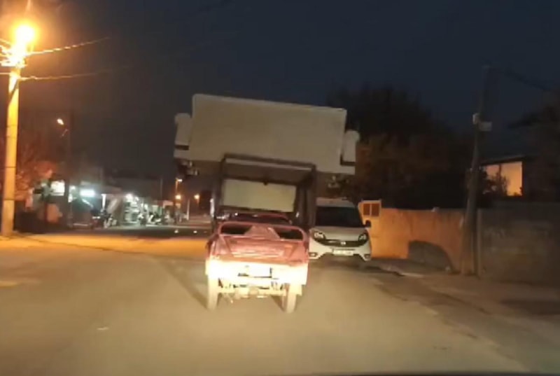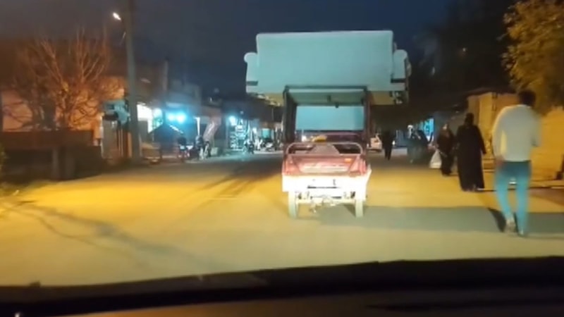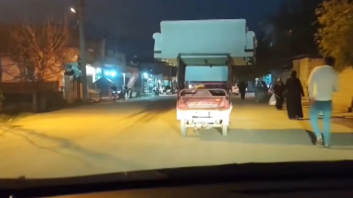 Hatay’ın Payas ilçesinde trafikte seyir halindeki bir sürücü, üç tekerlekli motosikletin üzerinde koltuk taşındığını fark edince o anları cep telefonu kamerasıyla kaydetti.