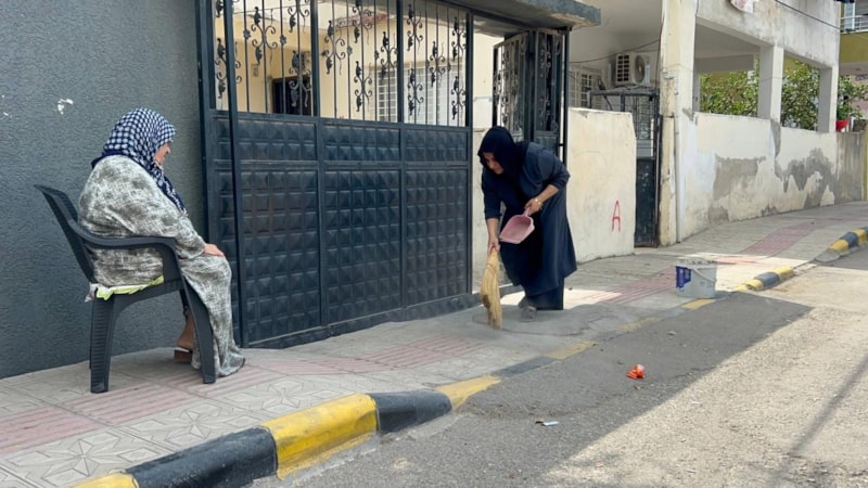 Annesinin elinden süpürgeyi devralan Saliha Özdemir, son 10 yıldır alışkanlık haline gelen ev önü temizlik geleneğini sürdürüyor.