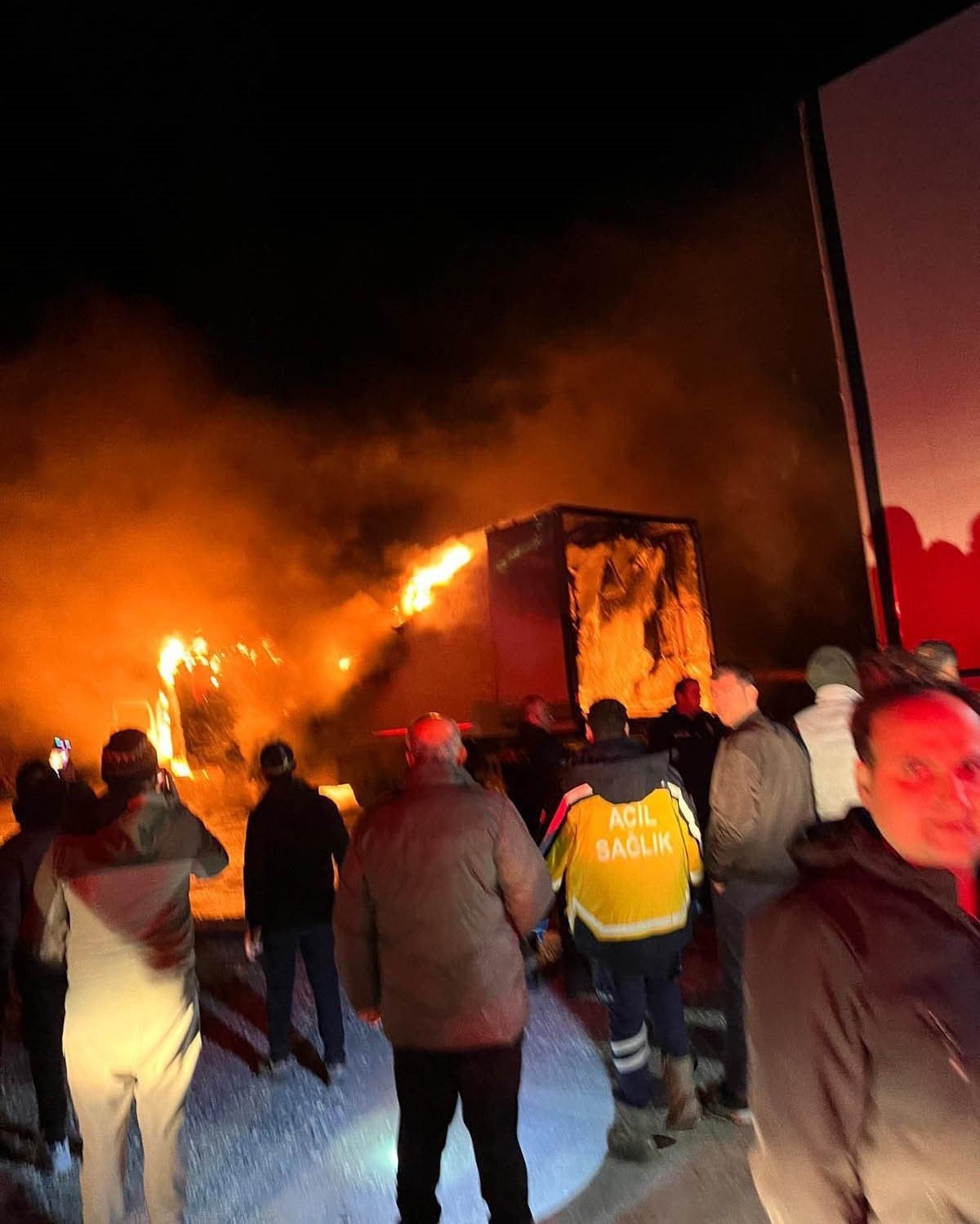 Alevler içinde kalan tırın yandığını fark eden vatandaşlar durumu 112 Acil Çağrı Merkezi'ne bildirdi.