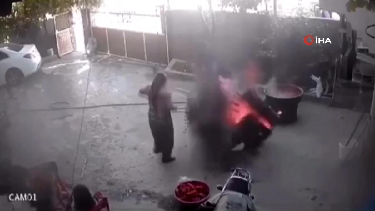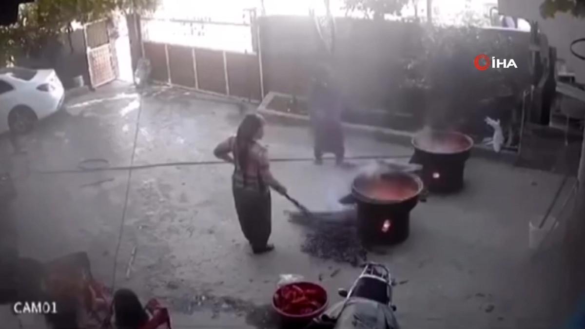 Salçayı kaynamaya bırakan kadınların kazanları, zeminde yaşanan patlamayla devrildi.