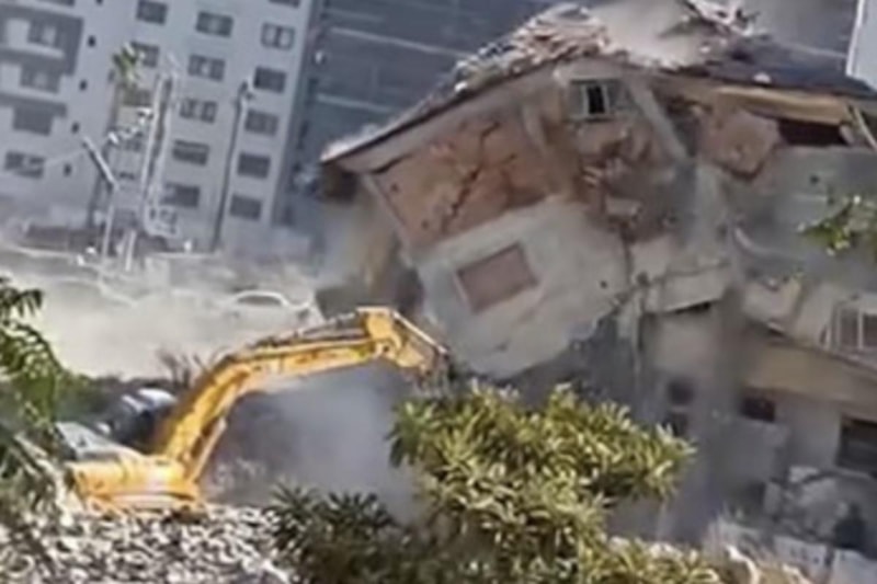 O makine binanın altından kalmaktan zor kurtuldu. Operatörde sorun olmadı. Binanın tamamı düşerken operatör boomu sağ tarafa çekerek iş makinesini kurtardı.