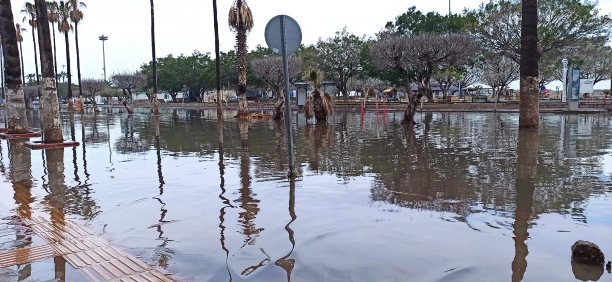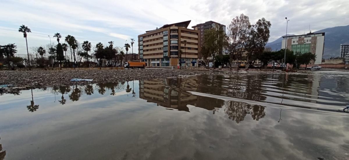 6 Şubat depreminde çöken İskenderun sahili yine göle döndü. Sabaha kadar süren yağış sonrası Çay Mahallesi, 15 Temmuz ve Atatürk Caddesi'nde diz boyu su birikti.