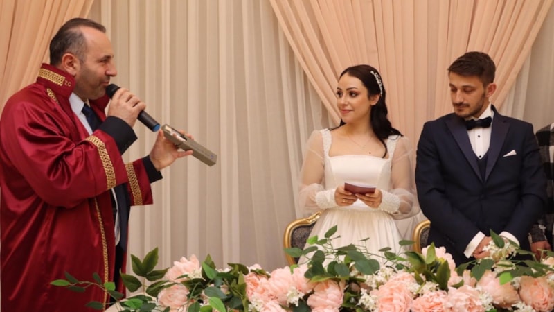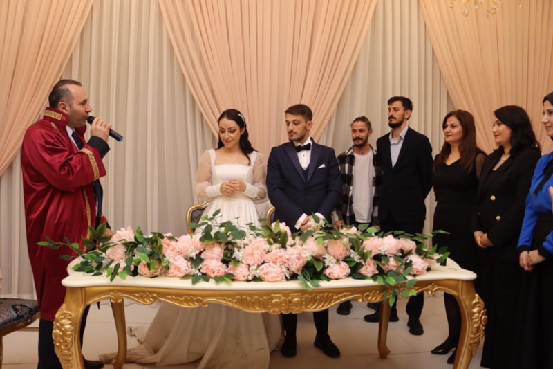 Genç çifte ömür boyu mutluluklar dileyen Tutuk, evlilik cüzdanını geline verirken, nikah imzalarının atıldığı kalemi ise damada hediye etti.