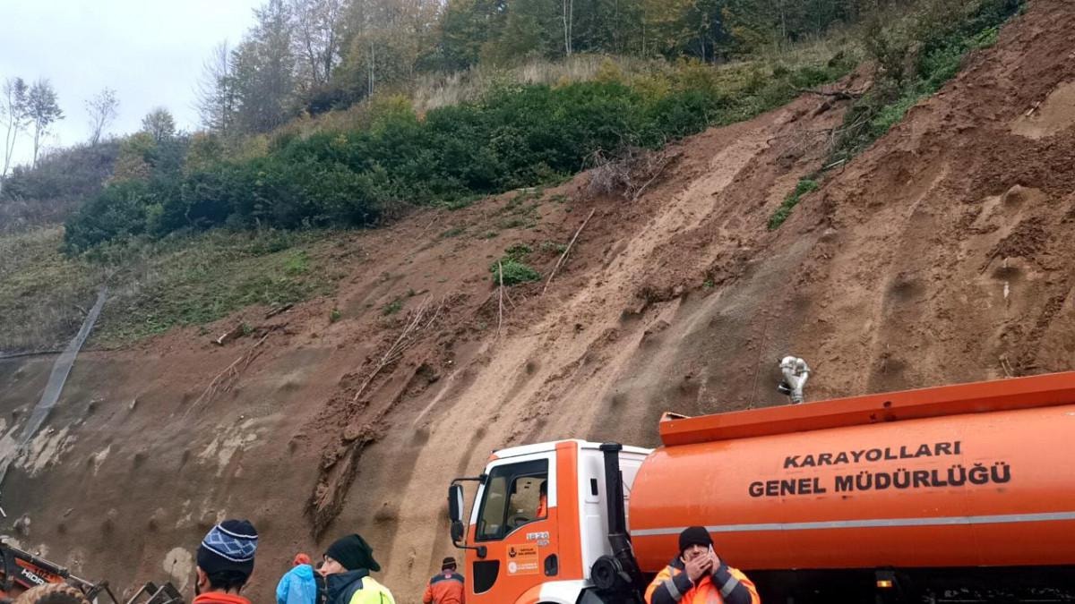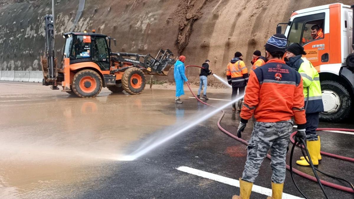 Sabah saatlerinden itibaren Karayolları ekipleri, heyelan riskinin olduğu kısımdan yola sızan çamurlu suyu temizledi.