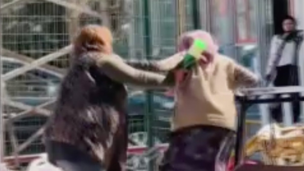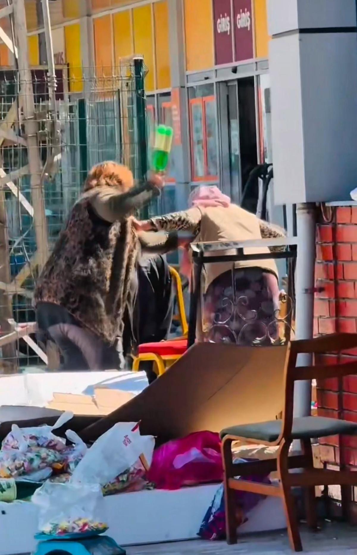 Iğdır'da bir marketin önünde satış yapan iki kadın, durdukları yer yüzünden tartışmaya başladı.