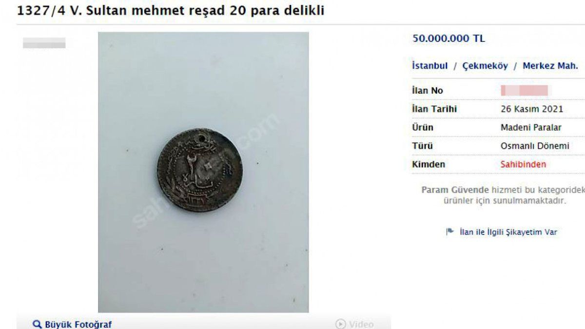 ‘Para, madalya' başlığı altındaki 17 binden fazla ilan arasında, 5'inci Mehmed dönemine ait delikli paranın en yüksek fiyattan satışa sunulduğu belirlendi.