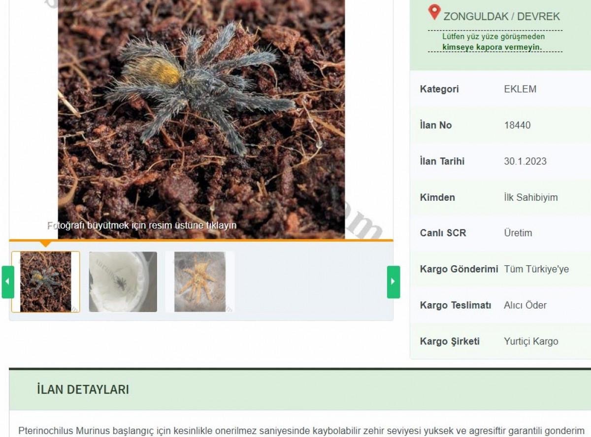 Yaklaşık 900 türü bulunan ve ana vatanı Avustralya ile Amazon ormanları olan tarantulaları satışa çıkaranlar, ilanlara da dikkat çeken açıklamalar yapıyor.
