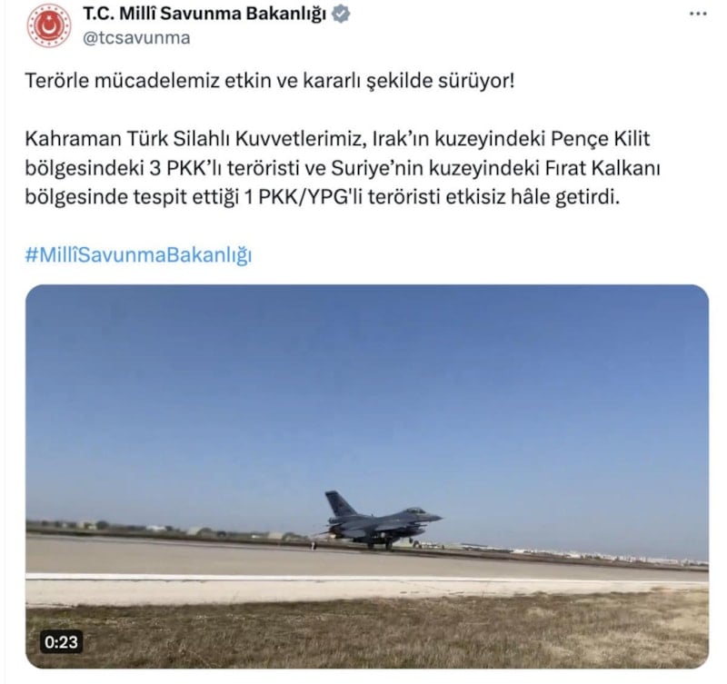 Milli Savunma Bakanlığı, Pençe Kilit bölgesinde 3, Fırat Kalkanı bölgesinde 1 teröristin etkisiz hale getirildiğini bildirdi.