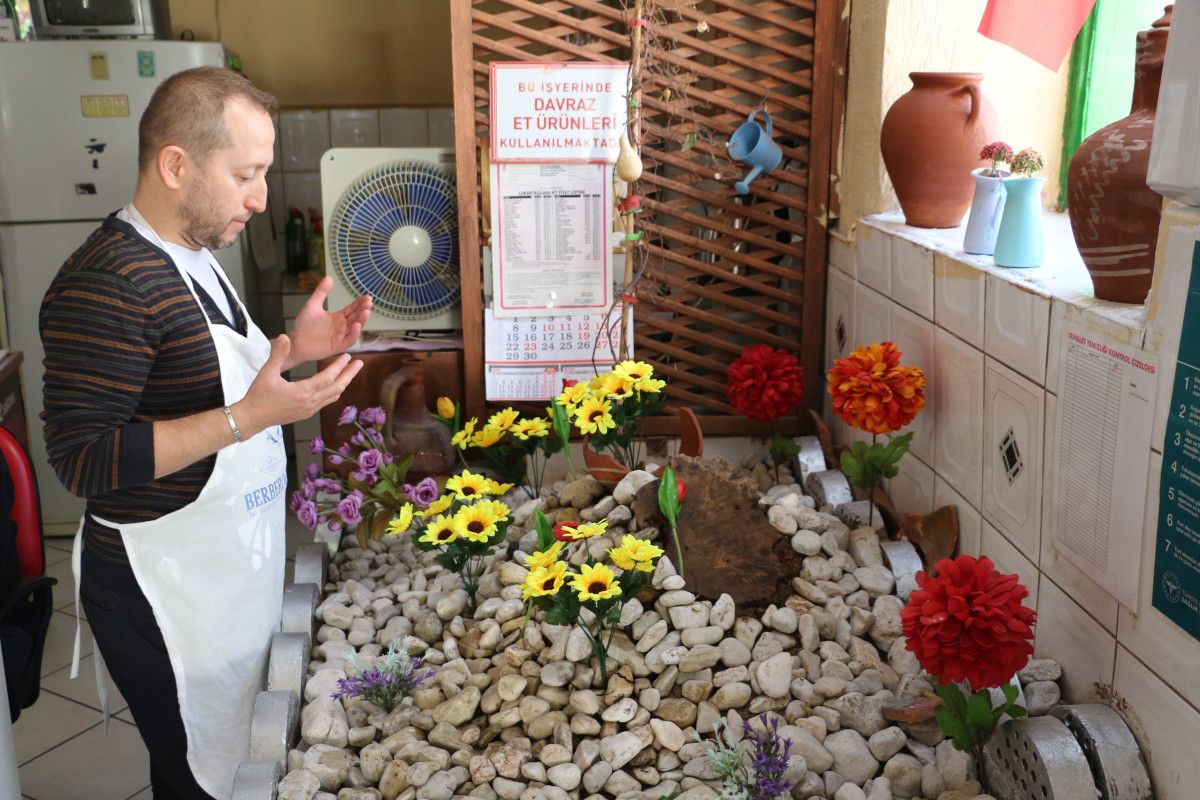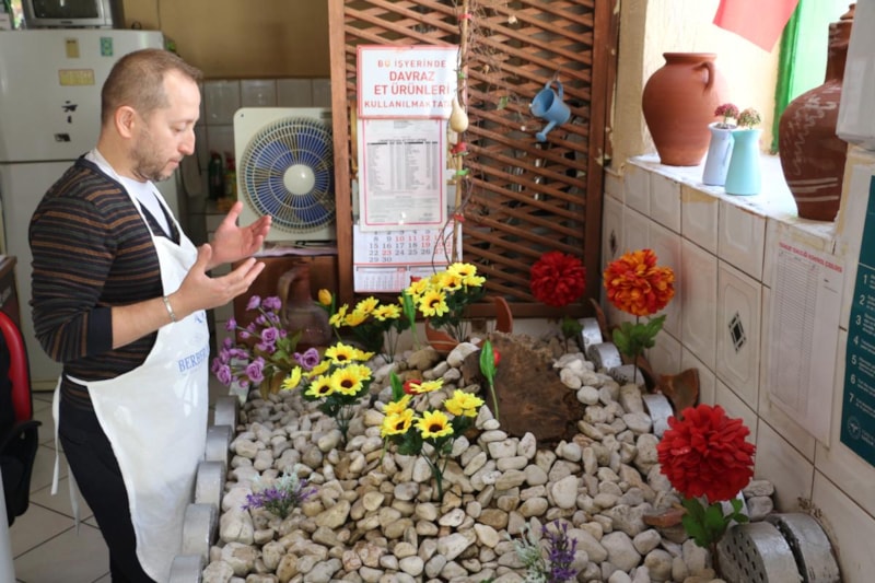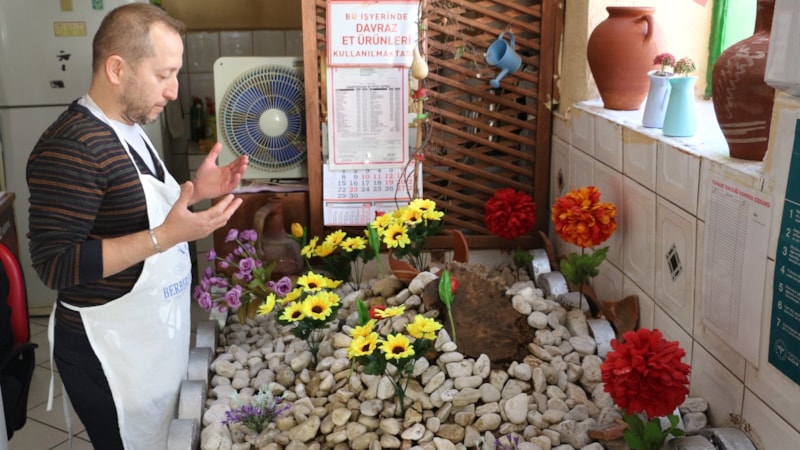 Burada bir yatır olduğunu biliyorduk. Etrafı taşlarla çevriliydi, bir mezarlığa benzemiyordu. Üzerinde büyük bir ağaç vardı, onu da kesmedik; pencere açarak dışarıya yönlendirdik. Ağaç zamanla kurudu ama kökünü hâlâ muhafaza ediyoruz. Bu mezarın en az 100 yıllık olduğuna inanıyoruz. İş yerimizi her sabah açarken dua ederiz. Saygımızdan dolayı mezarı temizleyip bakımını yapıyoruz.