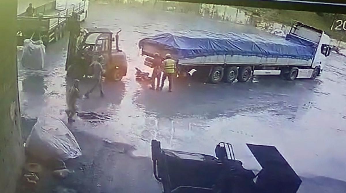 Görüntülerde, yük taşıyan forkliftin geri manevra yaptığı sırada tırın dorsesindeki brandayı örtmeye çalışan Erol Saygıvar'a çarptığı, ardından forklift ve dorse arasında sıkışan Saygıvar'ın yere düştüğü anlar yer aldı.