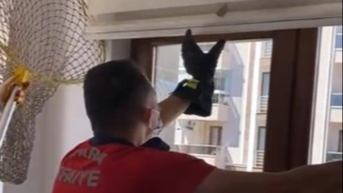 Yarasayı saklandığı yerden çıkaran itfaiye ekipleri, pencereden yaşam alanına saldı.