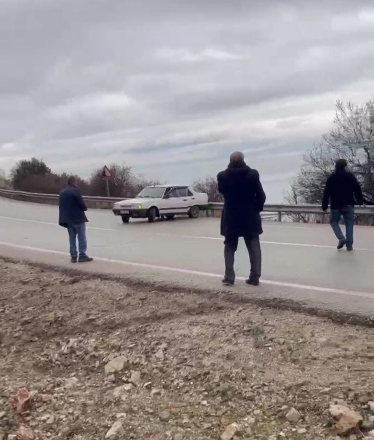 Araçtan inen yolcular Ali Ü. ve eşi Nuriye Ü. (59), yardım beklemek için yol kenarına geçti.