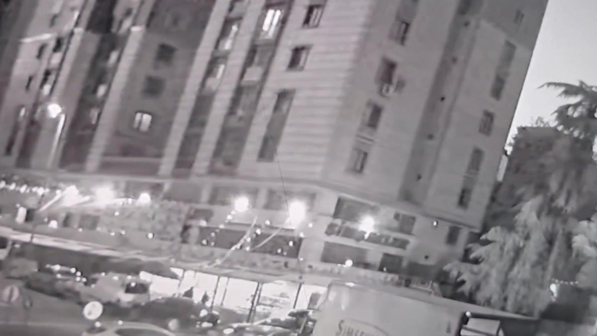 Doğalgaz parlaması sebebiyle panikleyen Dursun Erol'un binanın yedinci katından atladığı anlar sokaktaki bir iş yerinin güvenlik kamerasınca kaydedildi.