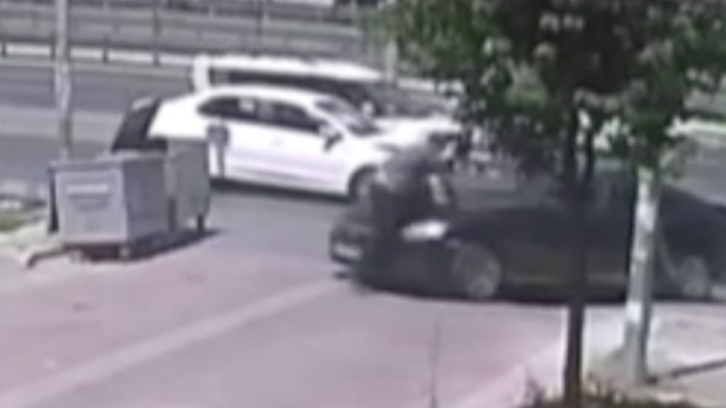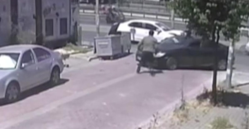 İstanbul Avcılar'da kazaya karışan otomobilin savrularak yolun karşısına geçmek isteyen yayaya çarptığı anlar güvenlik kamerasına yansıdı.