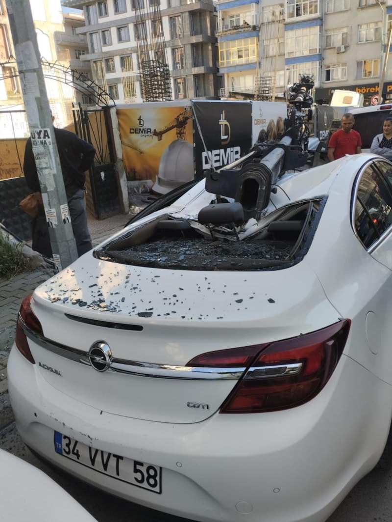 İstanbul Avcılar'da inşaat çalışması sırasında toprağın çökmesi sonucu vincin park halindeki otomobilin üstüne devrildiği anlar güvenlik kamerasına yansıdı.