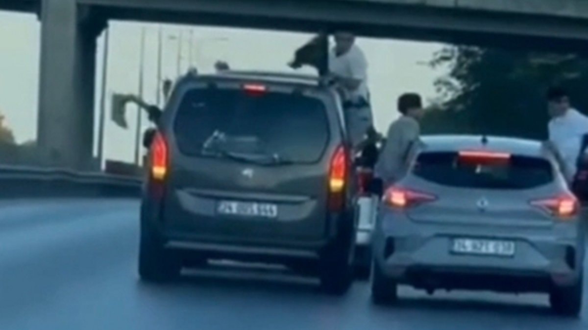 Camlarından sarkan kişilerle birlikte trafikte tehlikeli şekilde seyreden konvoydaki araçlar çarpışmaktan son anda kurtuldu.