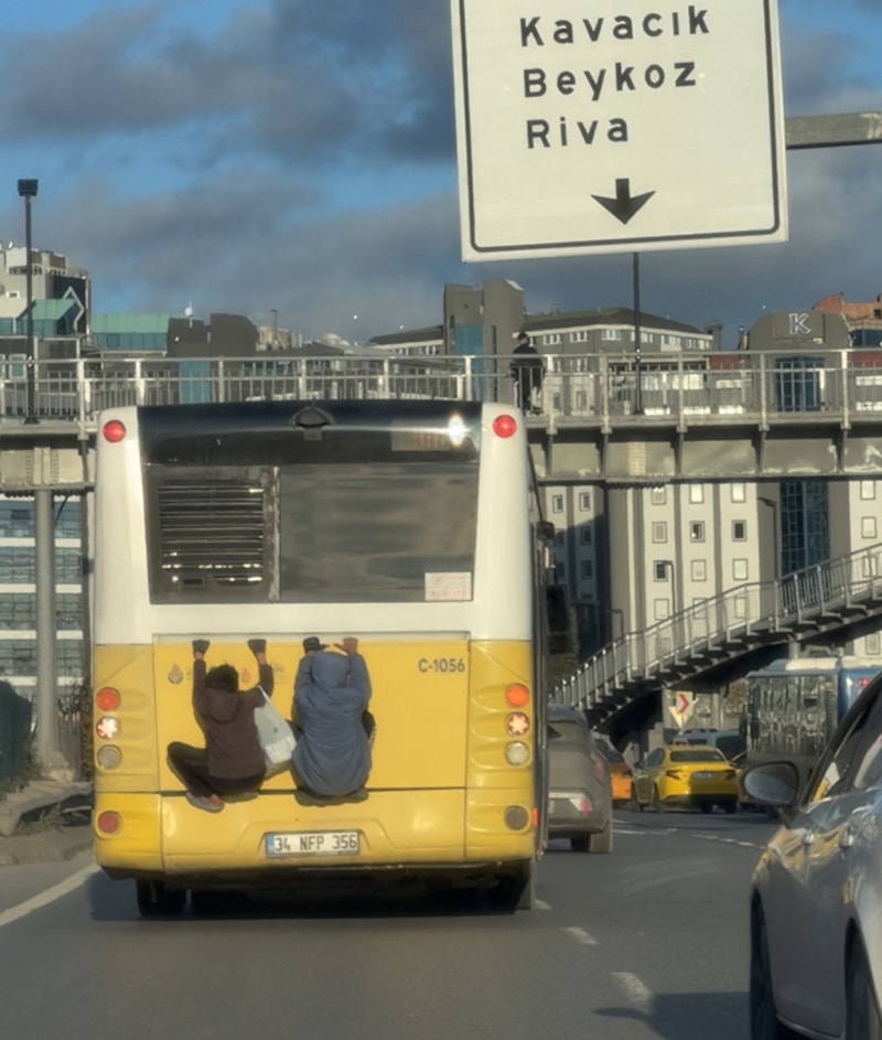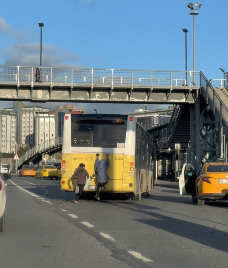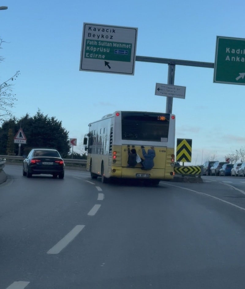 İstanbul'un Beykoz ilçesi Kavacık kavşağında seyir halinde olan İETT otobüsünün bagaj kapağına tutunan 2 çocuk, bir süre bu şekilde yolculuk etti.