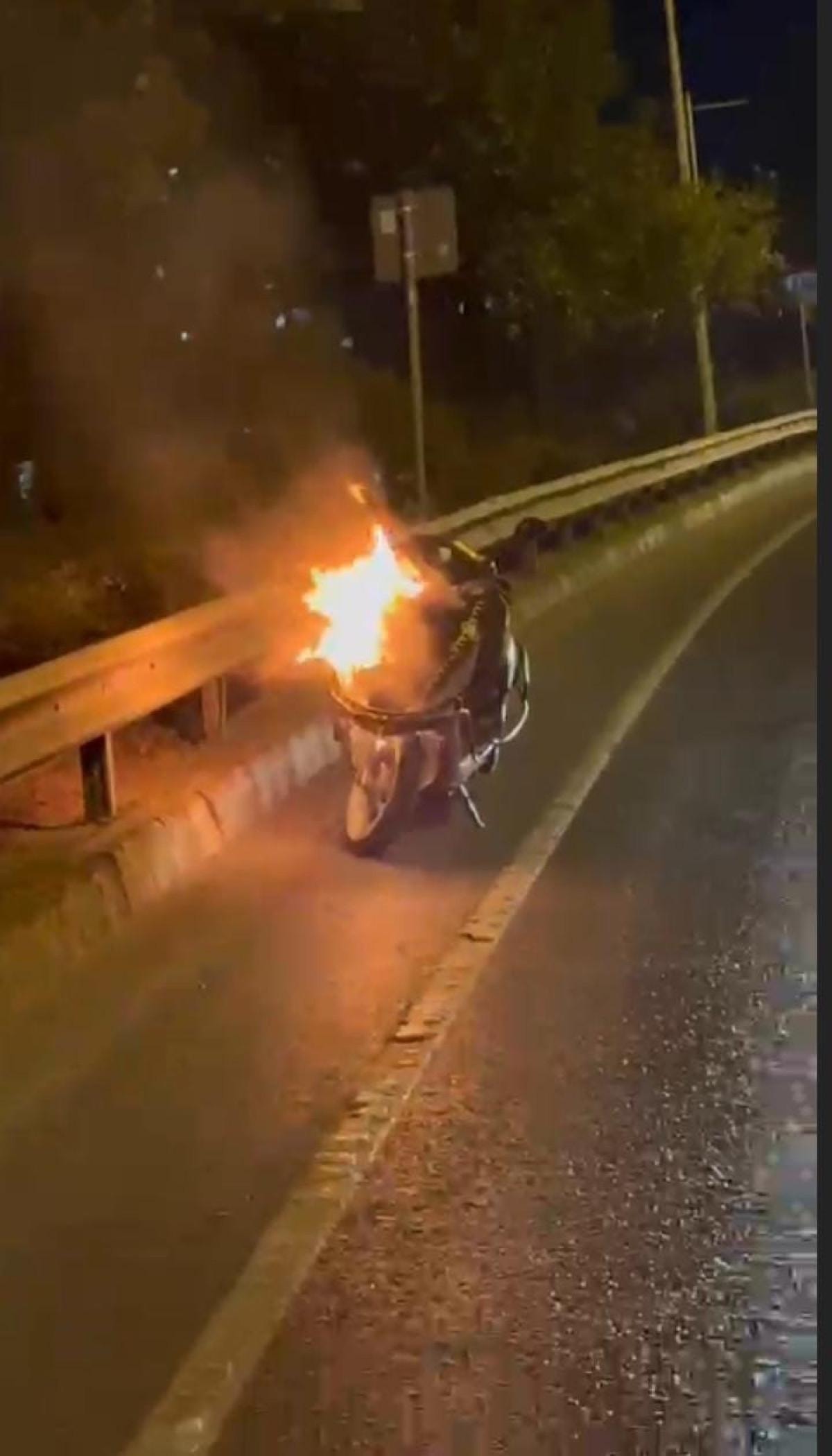 Durumu fark eden sürücünün yol kenarına park ettiği motosiklet kısa bir süre sonra alev alev yandı.