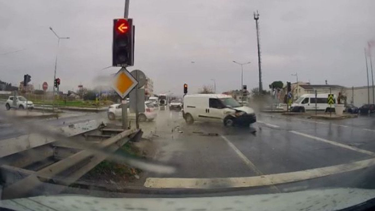 Görüntülerde sürücüsünün kırmızı ışıkta durmadığı hafif ticari aracın karşı yönden gelen otomobille çarpıştığı anlar yer aldı.