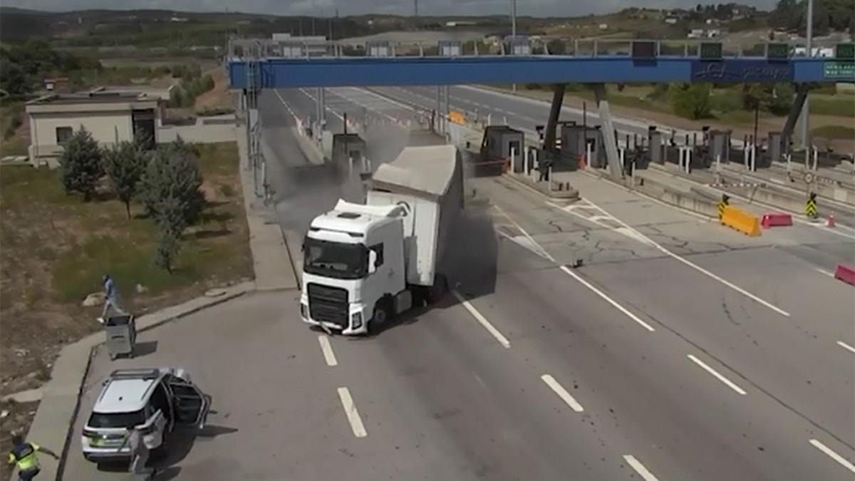 Görüntülerde tırın gişelere girerken kontrolden çıkarak bariyerlere çarpması, jandarmanın uygulama noktasına yönelmesi ve ekip aracına çarpması yer aldı.