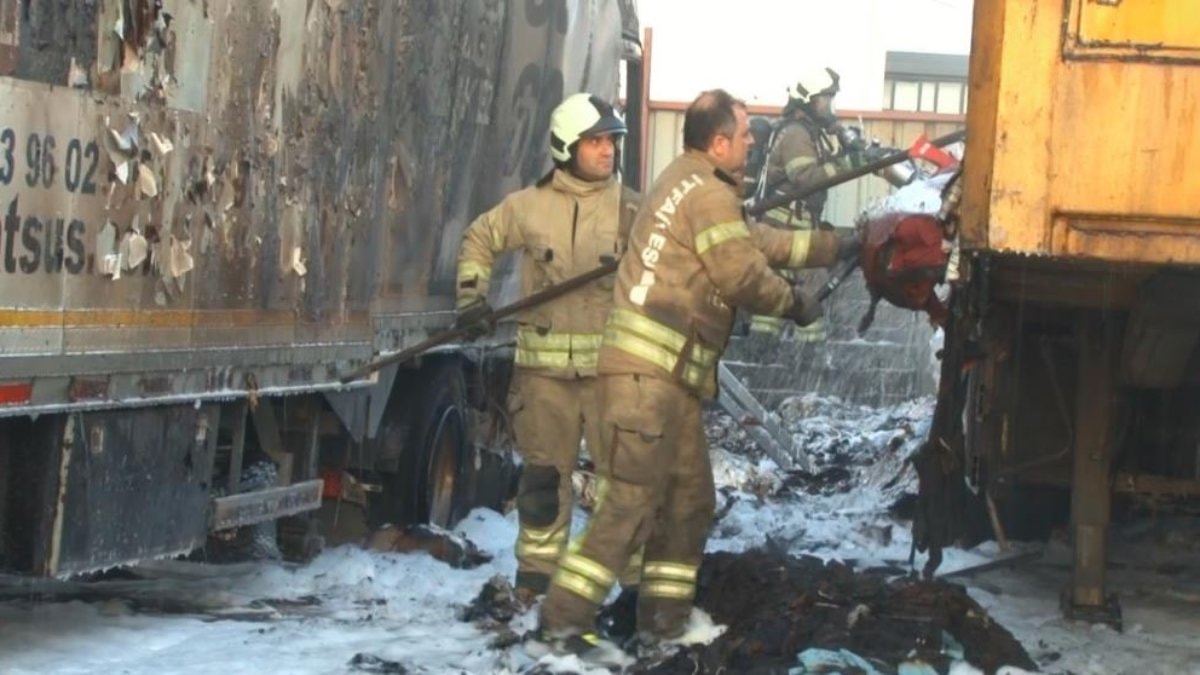 Alev alev yanan tırlara müdahale eden itfaiye ekipleri yangını kontrol altına
