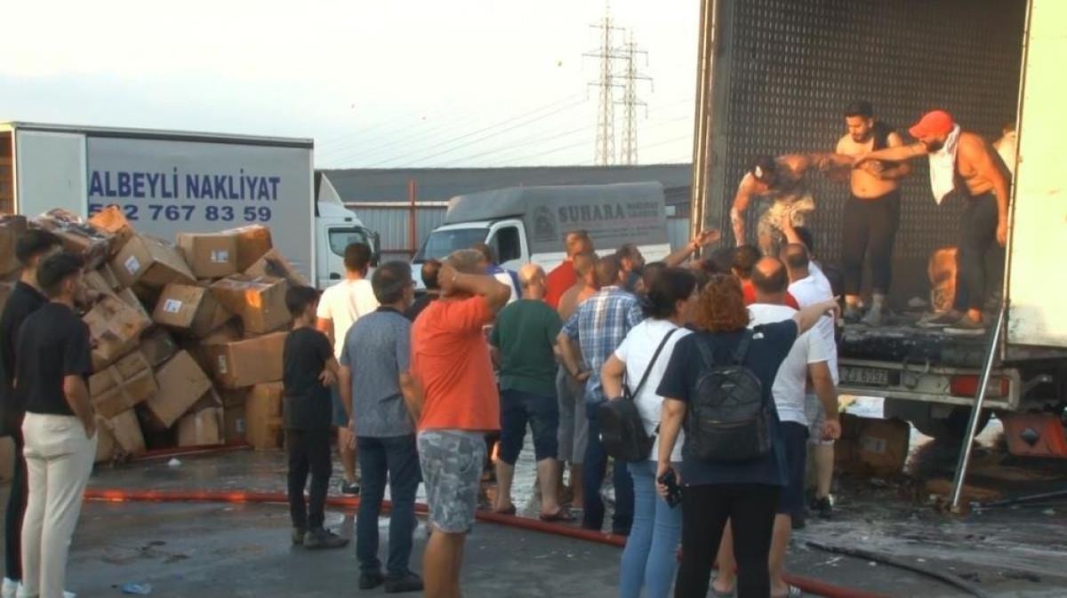 Dumanlar içerisinde tırın dorsesindeki malları indirmeye çalışan mal sahipleri kameraya yansıdı.