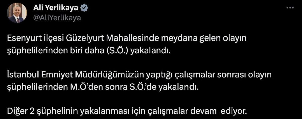 İçişleri Bakanı Ali Yerlikaya, sosyal medya paylaşımında, "Esenyurt ilçesi Güzelyurt Mahallesi'nde meydana gelen olayın şüphelilerinden biri daha (S.Ö.) yakalandı. İstanbul Emniyet Müdürlüğü'müzün yaptığı çalışmalar sonrası olayın şüphelilerinden M.Ö'den sonra S.Ö.'de yakalandı. Diğer 2 şüphelinin yakalanması için çalışmalar devam ediyor." ifadelerini kullandı.