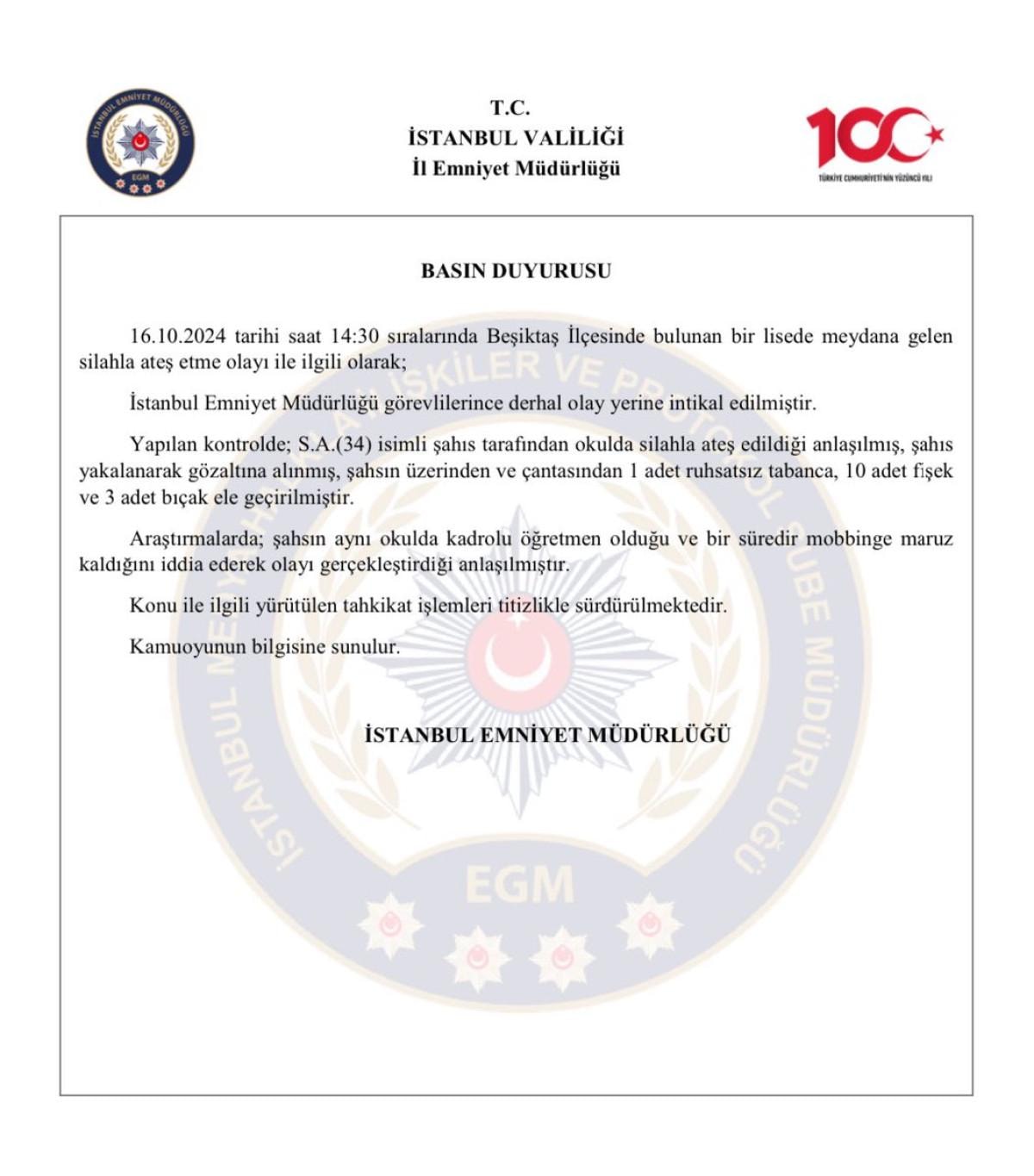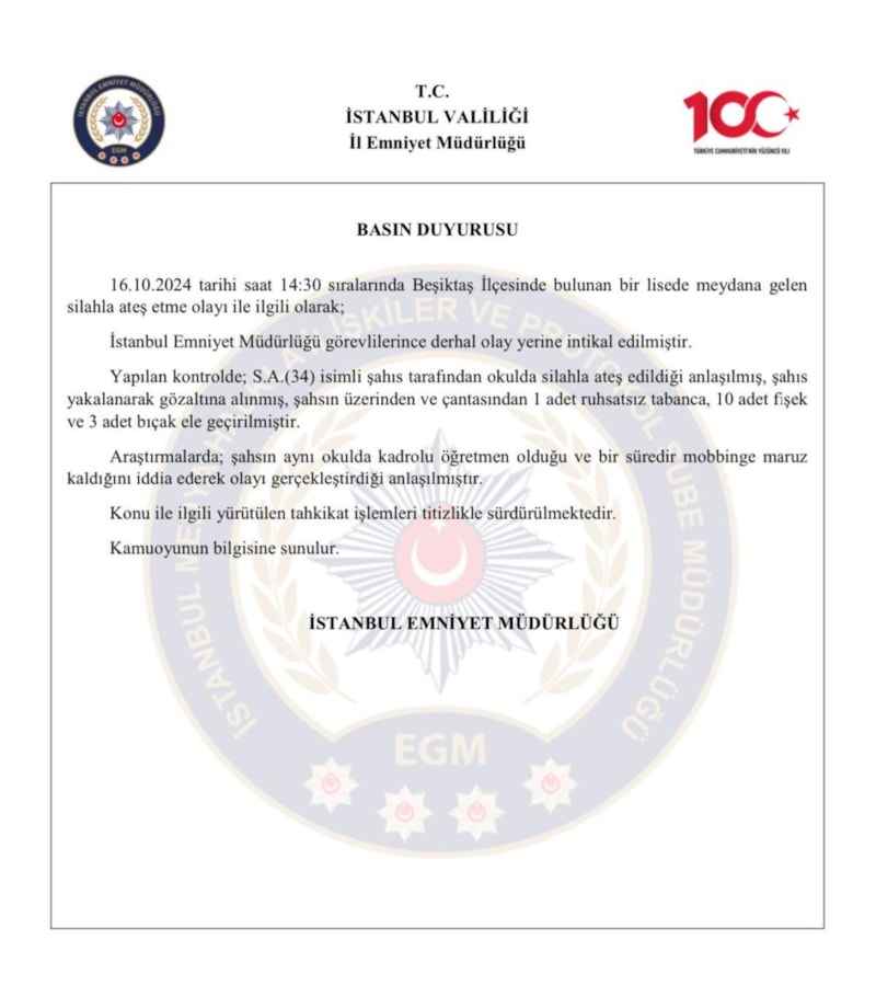 16.10.2024 tarihi saat 14:30 sıralarında Beşiktaş İlçesinde bulunan bir lisede meydana gelen silahla ateş etme olayı ile ilgili olarak;