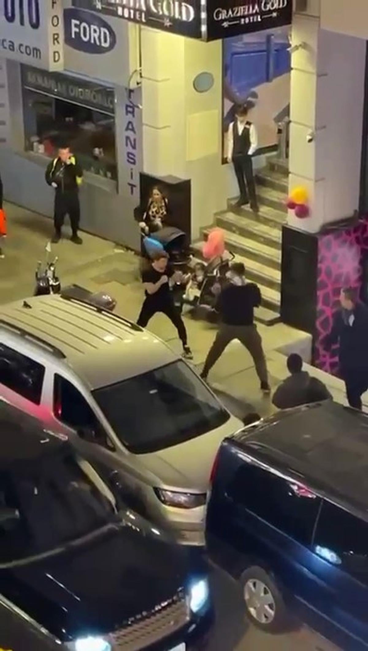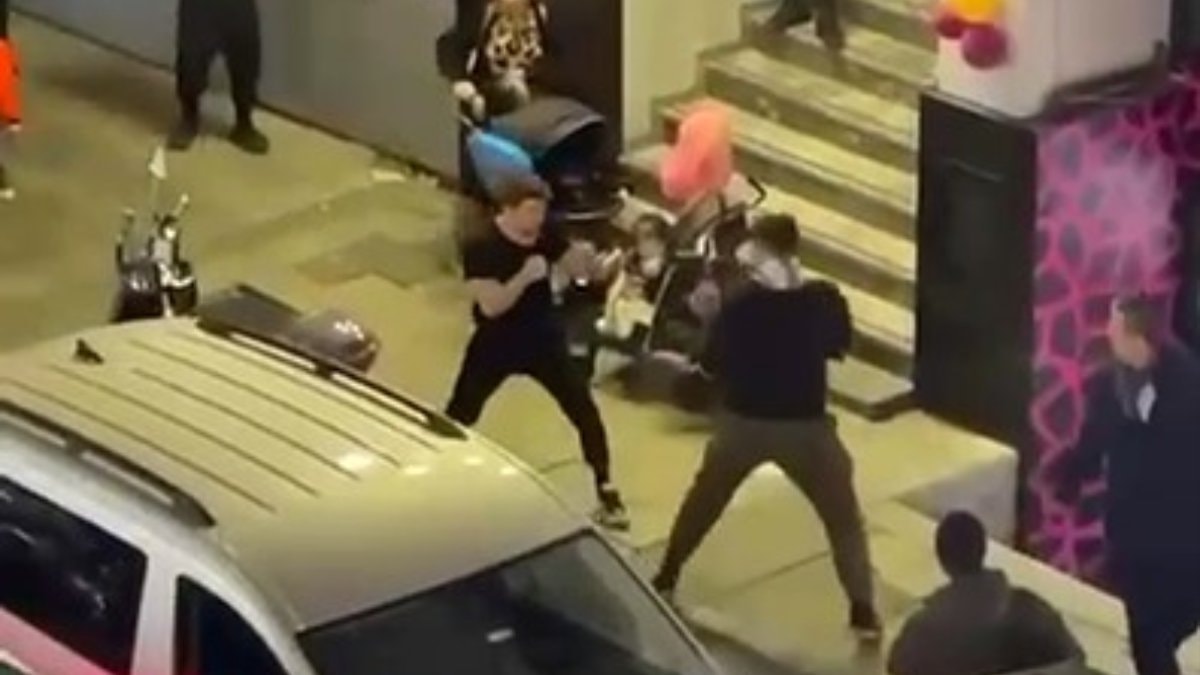 Görüntülere göre, kavga edenler, iki bebek arabası süren kalabalık bir ailenin ortasında, bebeklere ve kendilerini ayırmaya çalışanlara aldırış etmeden etraftakilerini de tehlikeye attı.